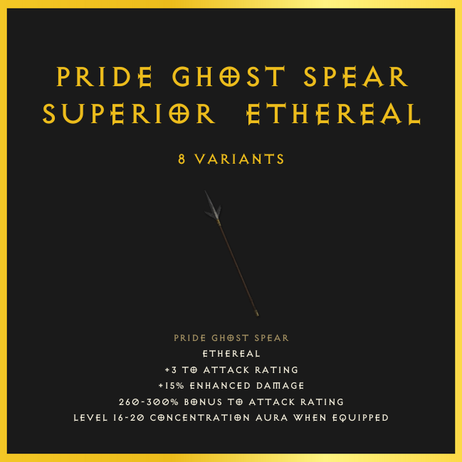 +15% Enhanced Damage,260-299% Bonus to Attack Rating,Level 16-19 Concentration Aura when equipped, Ethereal